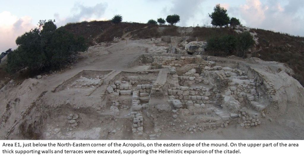 However, when the Acropolis was built in the Iron Age, and then during the Hellenistic period, supporting walls and thick terraces were erected in the eastern part, and they supported the massive fills in the eastern steep slope. The natural slope of the mound towards the east became even steeper, and the citadels that stood at its top for hundreds of years were built in its most strategic and commanding area, facing the Ellah Valley, the hill country to the east of the valley and the north-south road that passed below the Azekah–Goded ridge.