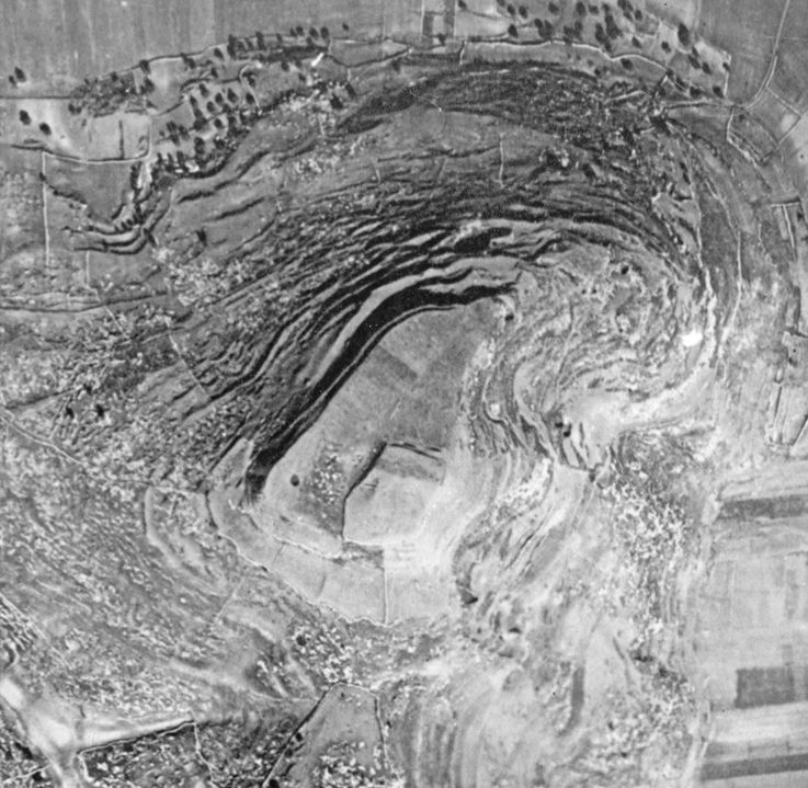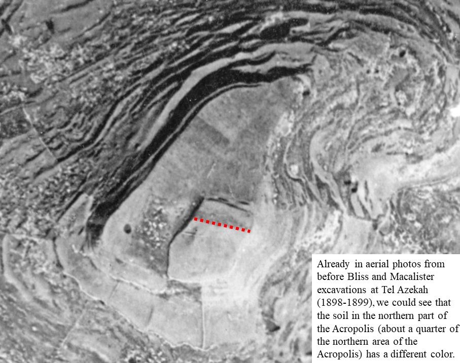 In aerial photos from before Bliss and Macalister’s excavations at Tel Azekah (1898-1899) we could see that the soil covering a quarter of the northern part of the Acropolis has a different colour.
