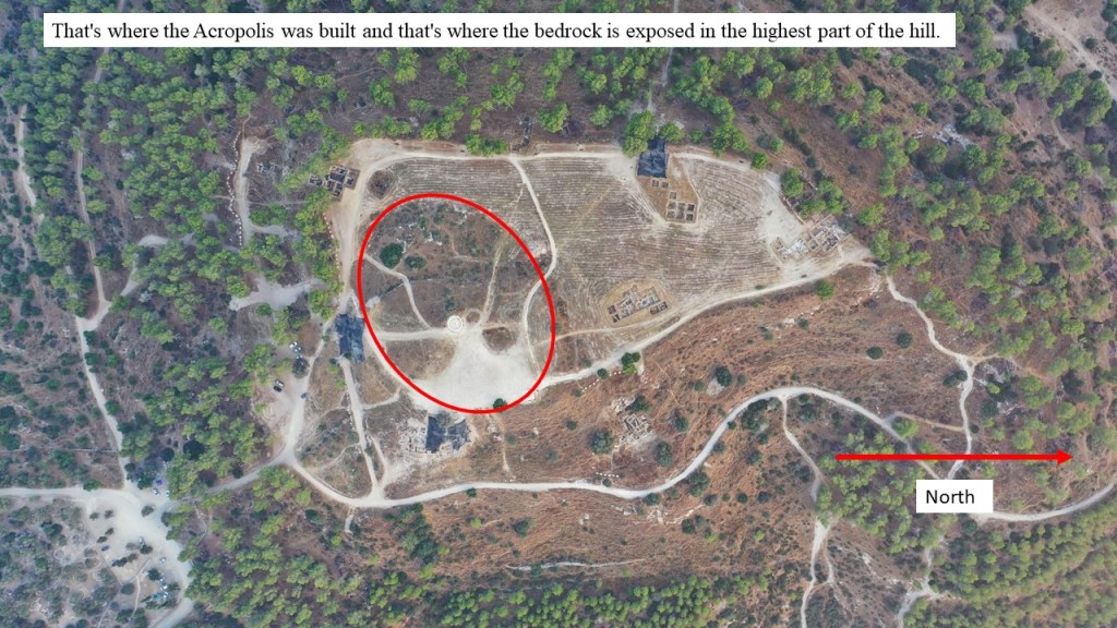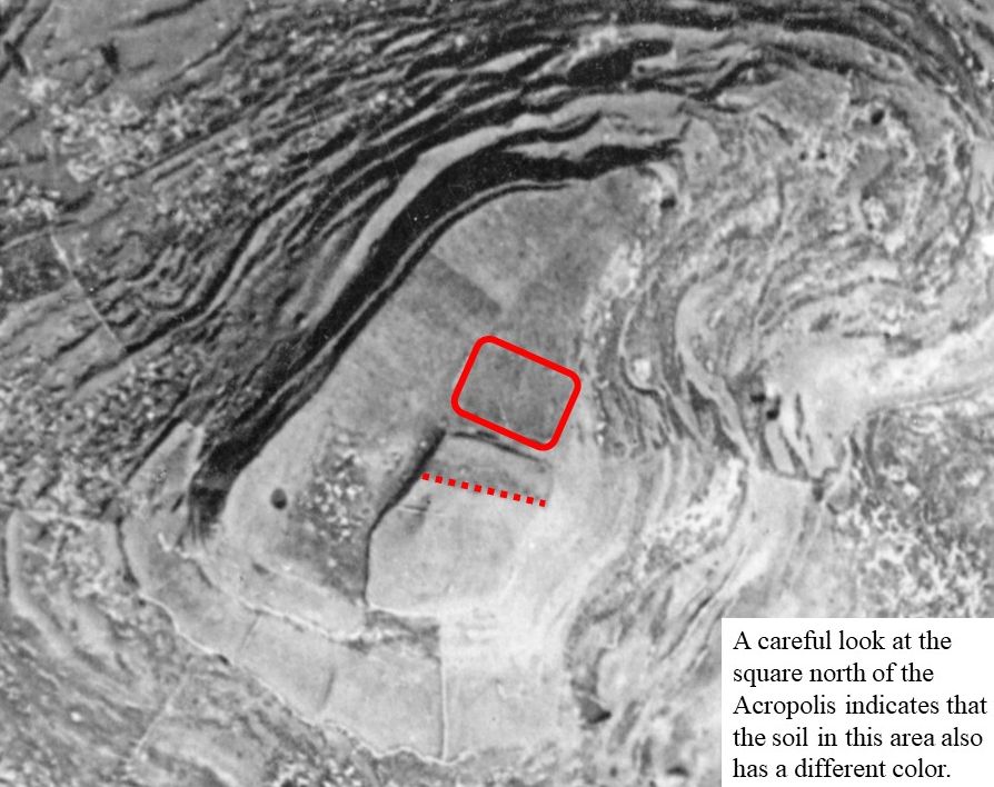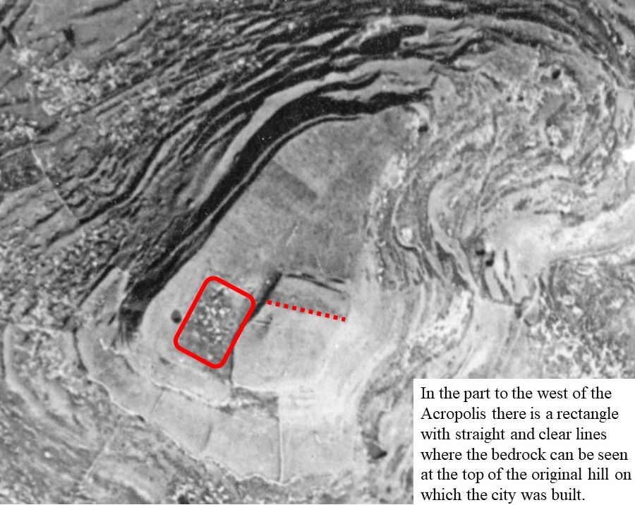 A careful look at the square north of the Acropolis indicates that the soil in this area also has a different colour. In the west of the Acropolis, at the top of the original hill on which the city was built, there is a rectangle with straight and clear lines where the bedrock can be seen.