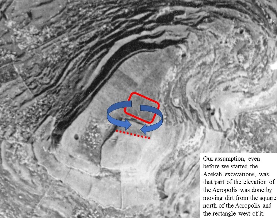 Our assumption, even before we started the Azekah excavations, was that part of the elevation of the Acropolis was done by moving dirt from the square north of the Acropolis and the rectangle west of it.