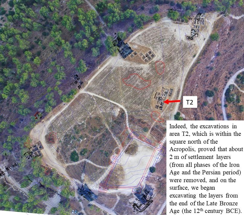 Indeed, the excavations in area T2, which is within the square north of the Acropolis, proved that about 2 m of settlement layers (from all phases of the Iron Age and the Persian period) were removed, and on the surface, we began excavating the layers from the end of the Late Bronze Age (the 12th century BCE).