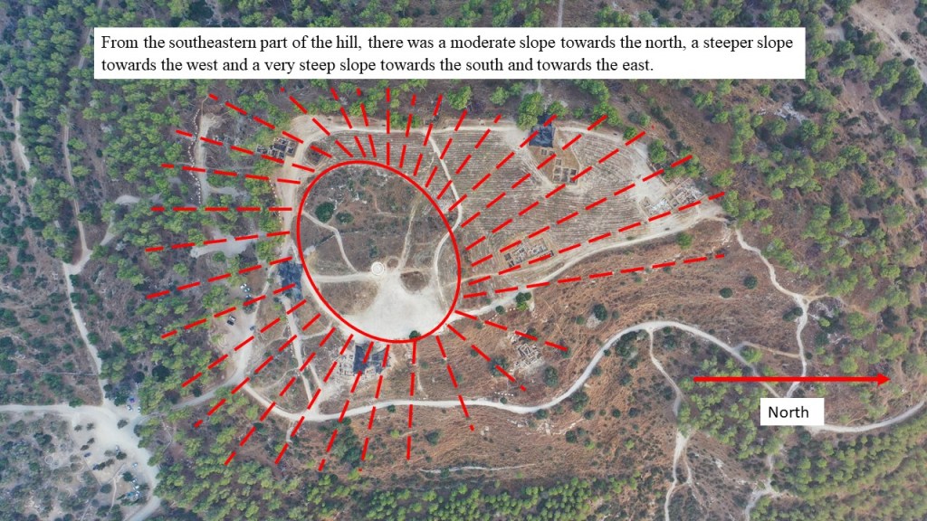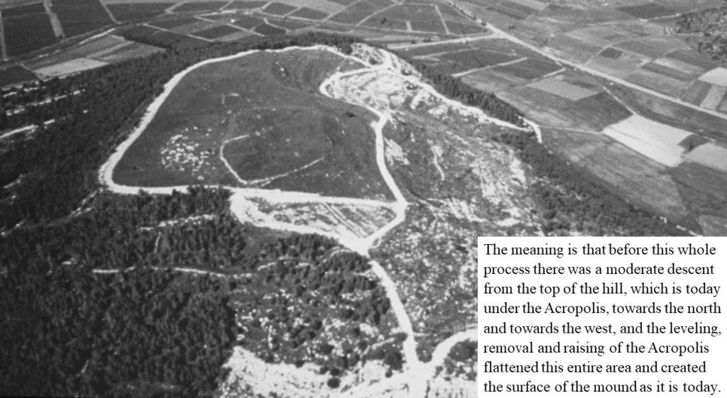 The meaning is that before this whole process began, there was a moderate descent from the top of the hill, which is today under the Acropolis, towards the north and the west, and the raising of the Acropolis by removal of soil from these areas flattened it and created the surface of the mound as it is today.