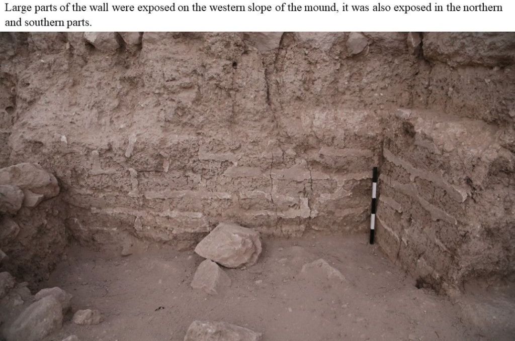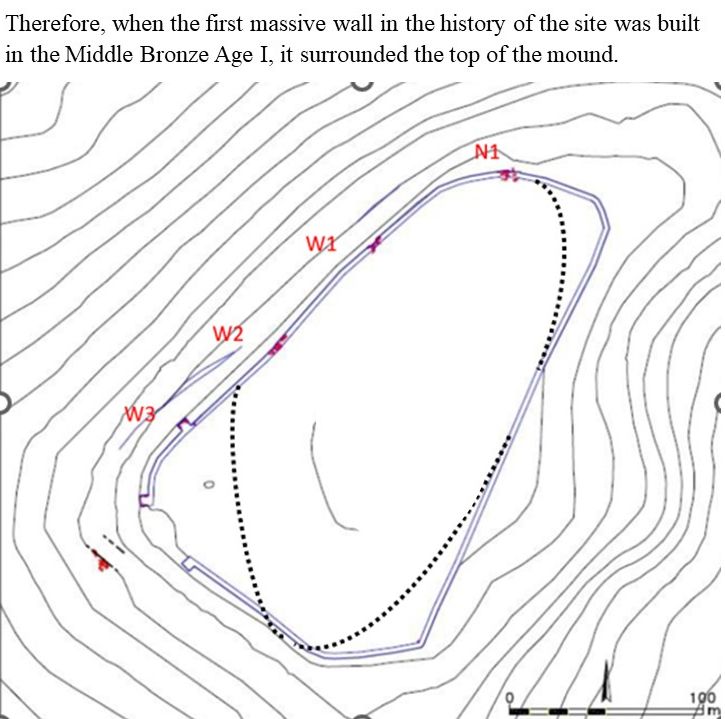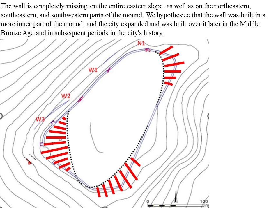 We hypothesize that the wall was built in an inner part of the mound, and the city expanded and was built over it later in the Middle Bronze Age and subsequent periods of its history.